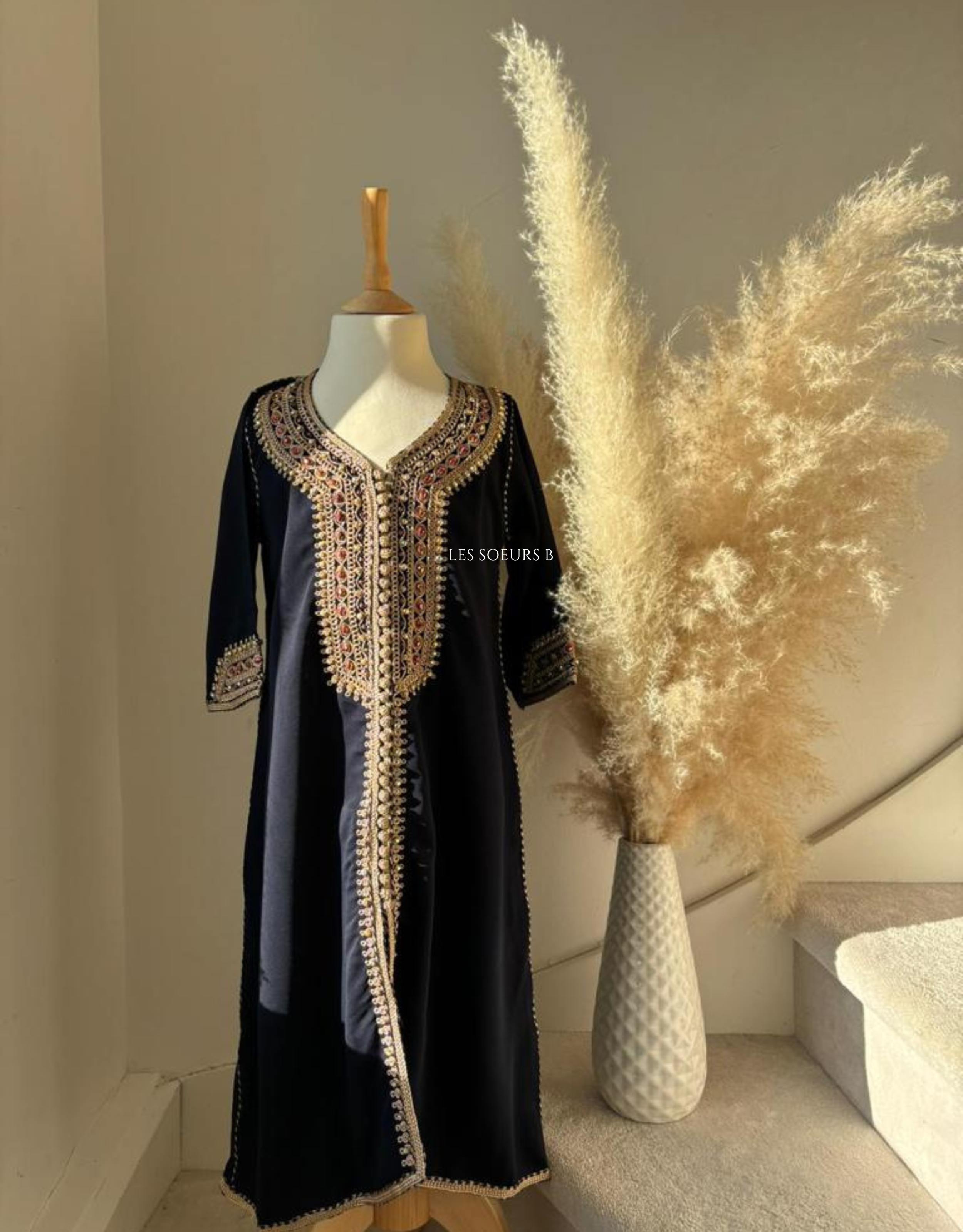 Caftan avec la broderie gold. Manche longues. Les perles sont cousues sur la tenue. La ceinture n'est pas fournie avec le caftan.